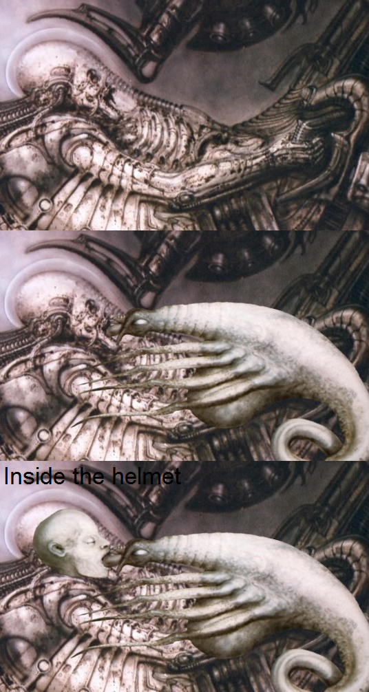 11) As the Engineer was done setting a destination,the old SJ suit covered him.Suddenly the facehugger jumped on his helmet,pushed the tentacle through the helmet mouth and started impregnating him that way (the mouth of the helmet remained open from that point on).