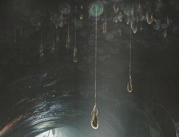 10) The body of the Alien dropped next to one of the ovomorphs that evolved from the black liquid.The ovomorph opened and the facehugger that came out of it climbed up towards the hole.