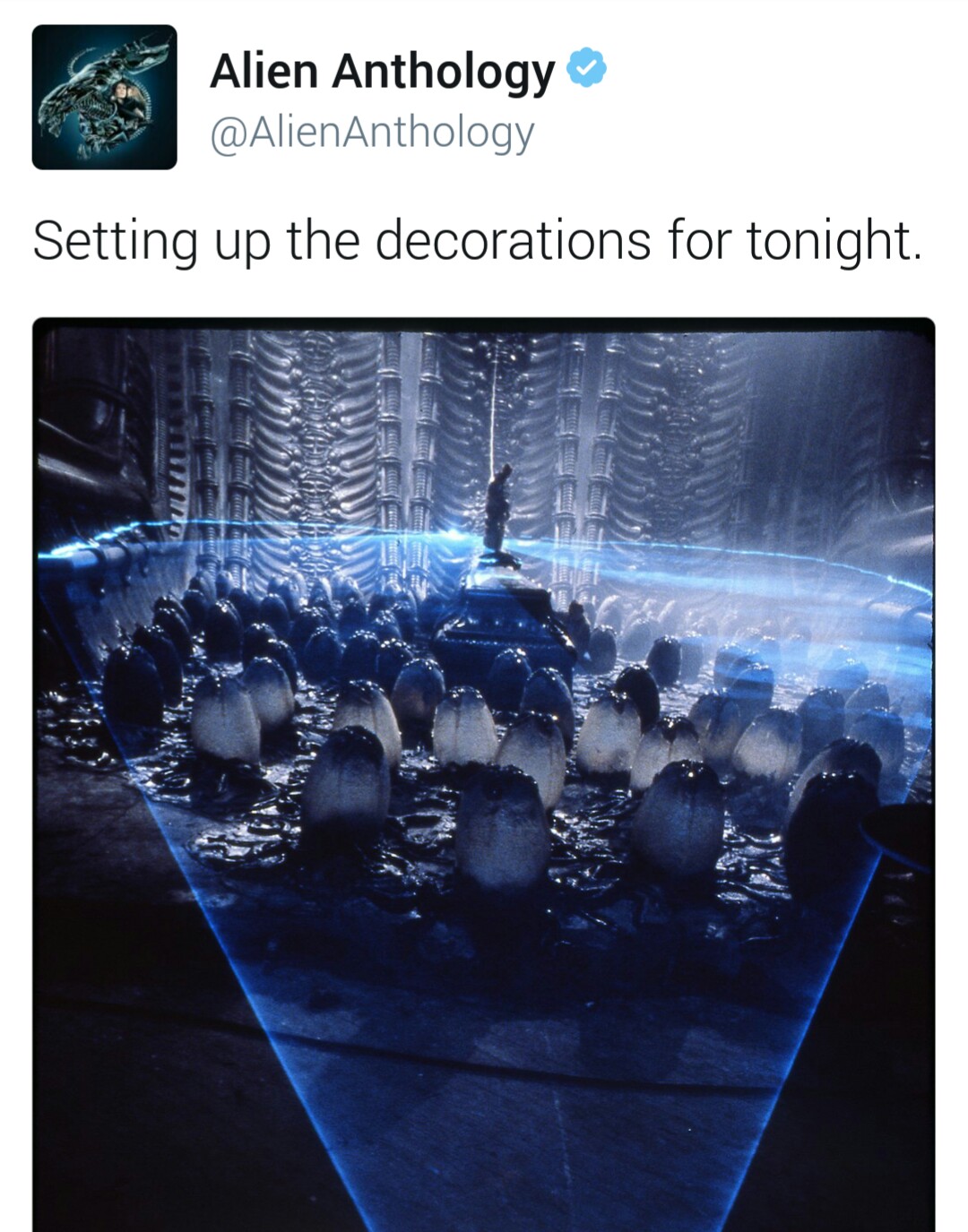 Fox just shared a photo from what I believe to be the original Derelict set from ALIEN, with the caption "Setting up the decorations for tonight". Now, this could be a recreated set for Alien: Covenant, which would be a major spoiler as it would confirm Covenant revisits the original Derelict on LV-426. However, the eggs look different to the ones in the recent leak, so I'm going to assume this is not from Alien: Covenant.