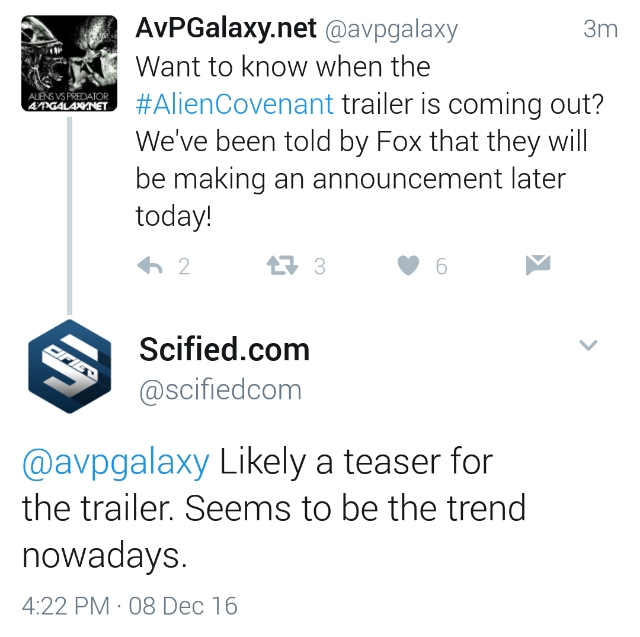 AdminEngineerDecember 08, 201646287 Views27 Replies![[UPDATE] Alien: Covenant trailer announcement coming tonight from Fox!](https://scified.com/topics/117947103071358.jpg)