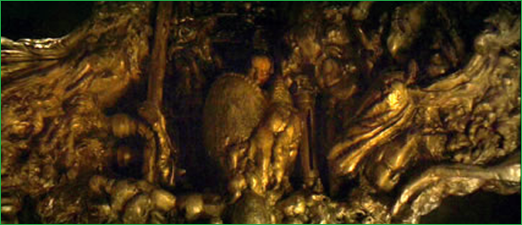 The mural if u look closely behind and upp the deaconish alien...has a huge queen head shell...and on the downside...facehuggers and humans..bald ones.maybe engineers.