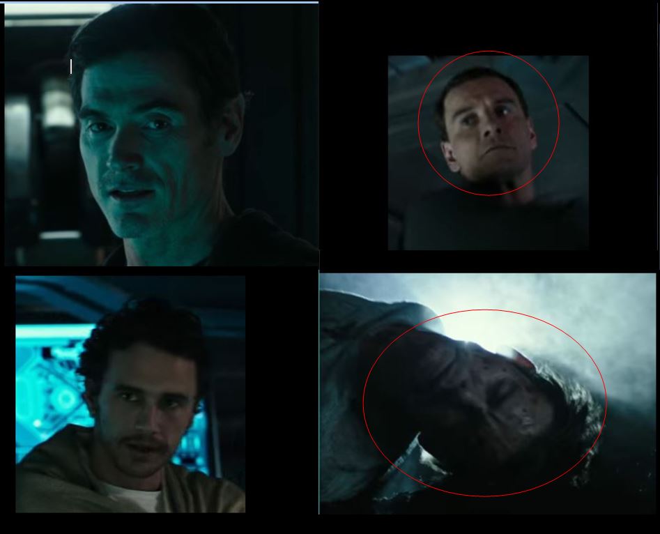 The guy in that picture looks like his hair is too long to be Fassbender to me. I actually have no idea who he is, Crudup's stunt double? He's the only one for sure we know right now who gets facehugged. Somebody else entirely? And I actually don't think David experiments on Shaw at all.