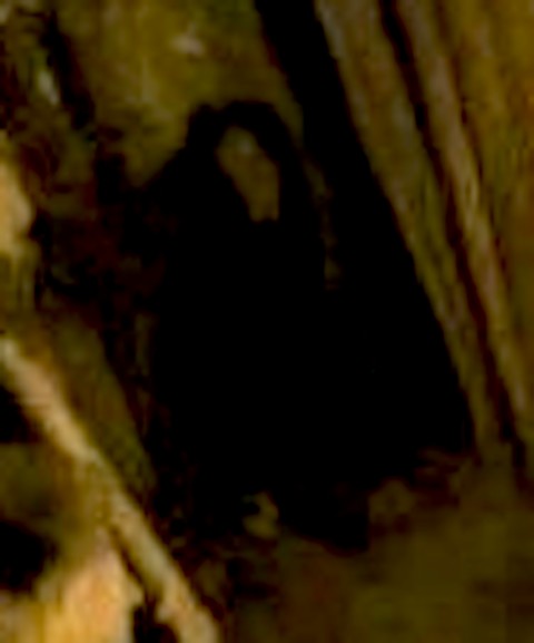 This figure looks to be wearing a cloak or has dark hair and clothing. I can see the face and it looks to me as if the hands are both clasped over the mouth, as if in shock?