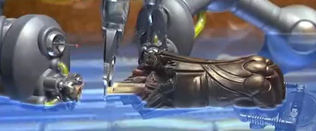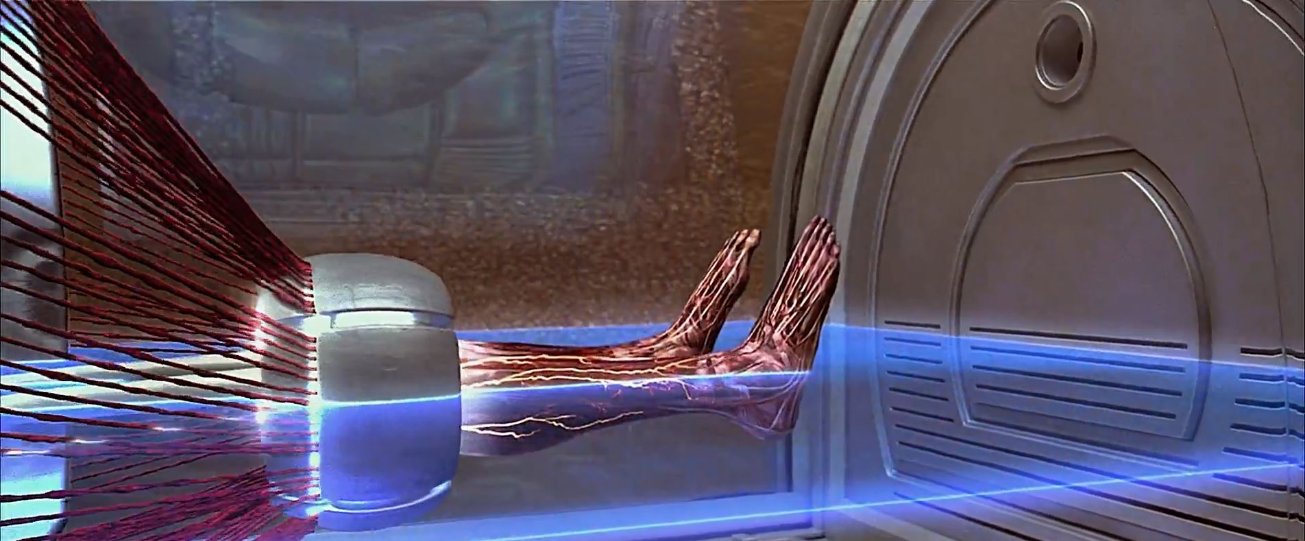The scanning across the tissue-matrix like material reminds me of Fifth Element (below two photos) when UV was used to stimulate the growth of skin cells when 3D printing LeeLoo (process below).