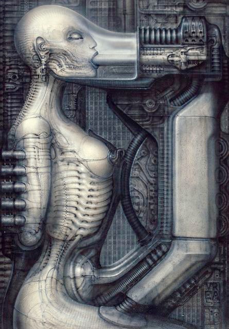 Plus also description of a Scene/Concept work where it depicts a Humanoid connected to some HR Giger type Machine that would be like the Robot Girl from Superman 3 but done in the style of HR Giger...