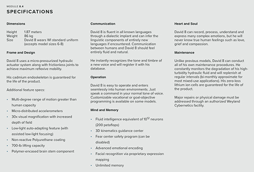 The humans are setting the mission agenda and directing the technology development but as the technology becomes more complex, humans rely on artificial intelligence to operate and repair their technology. David models are repaired by David 8 models.