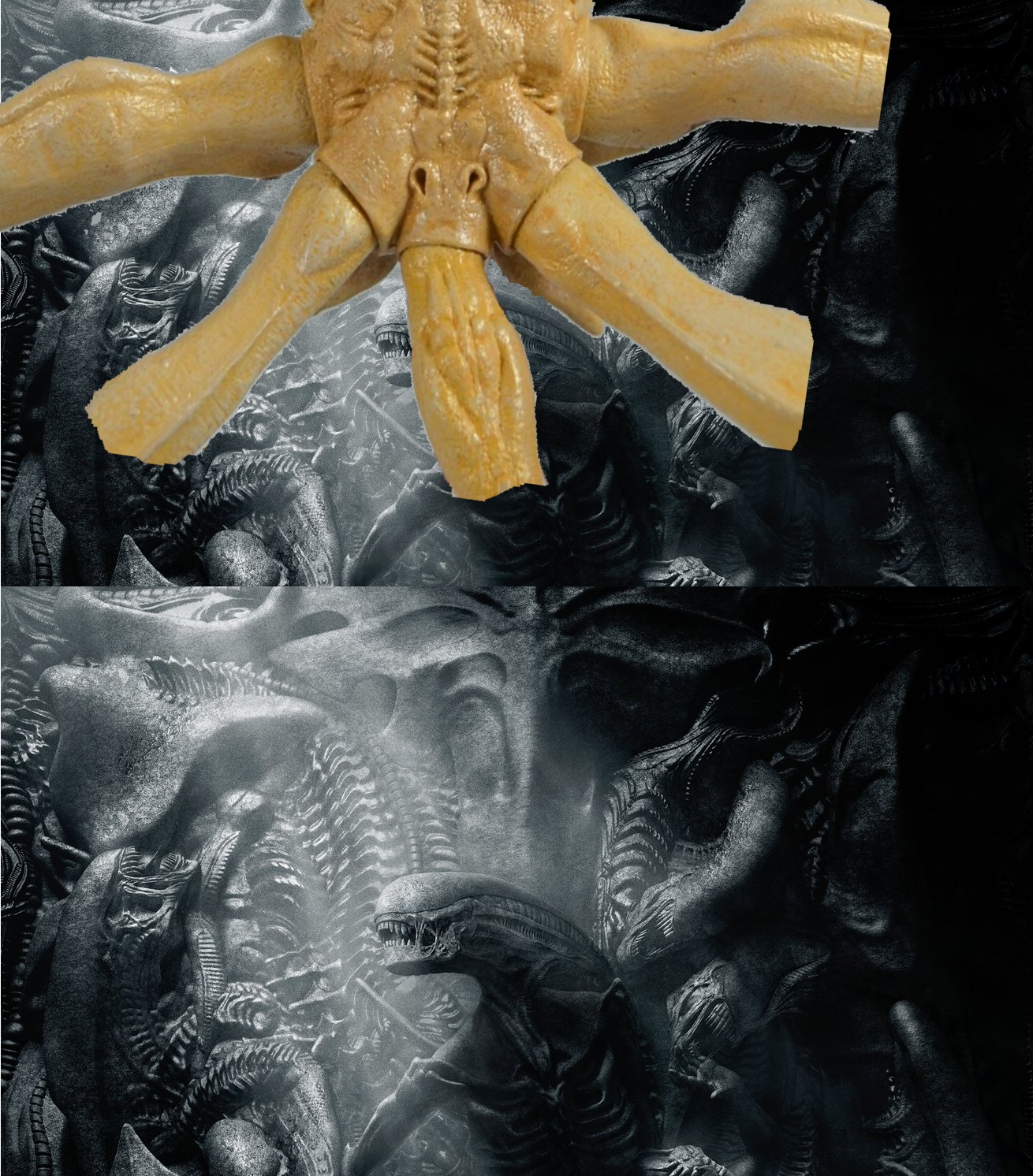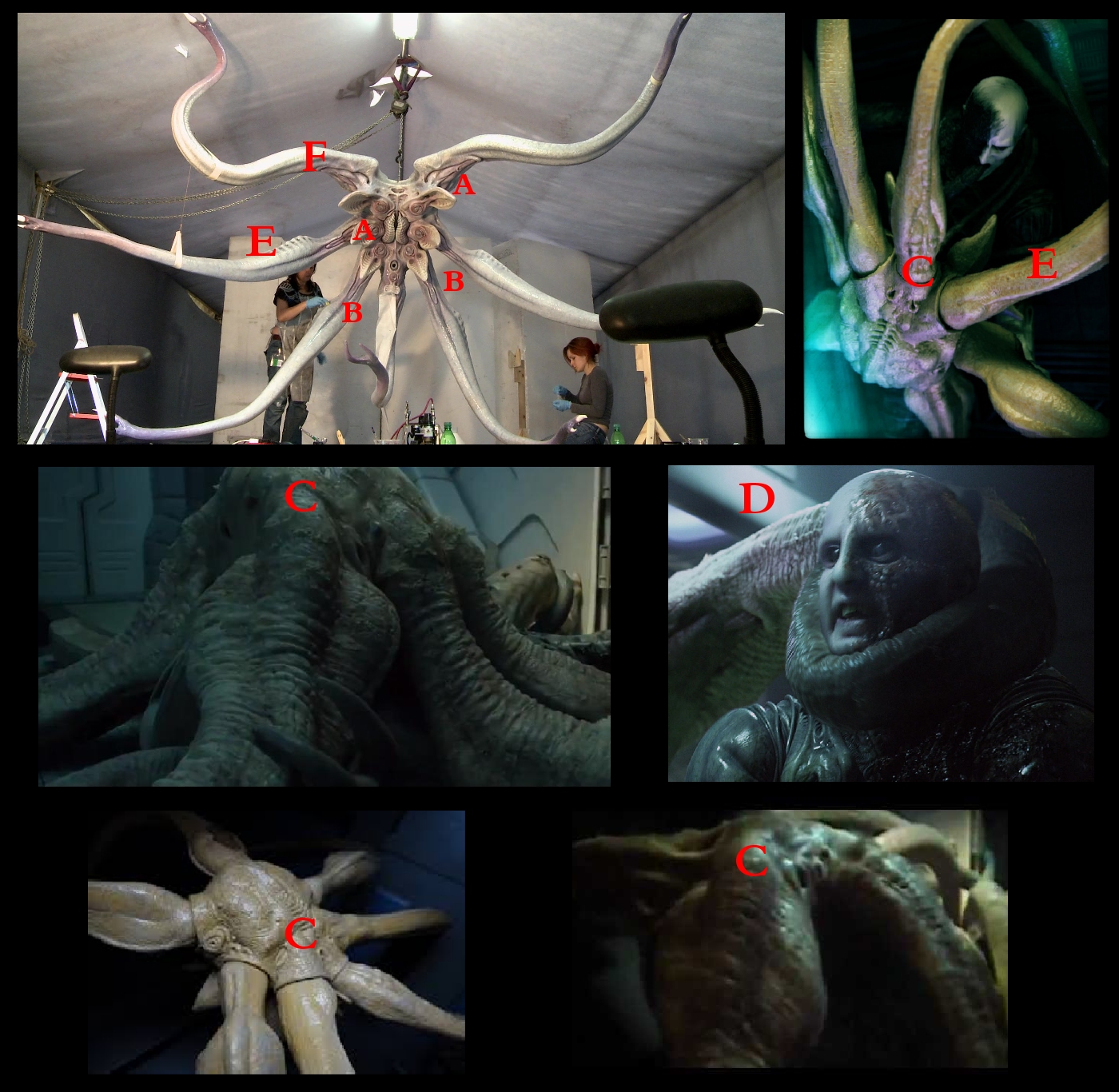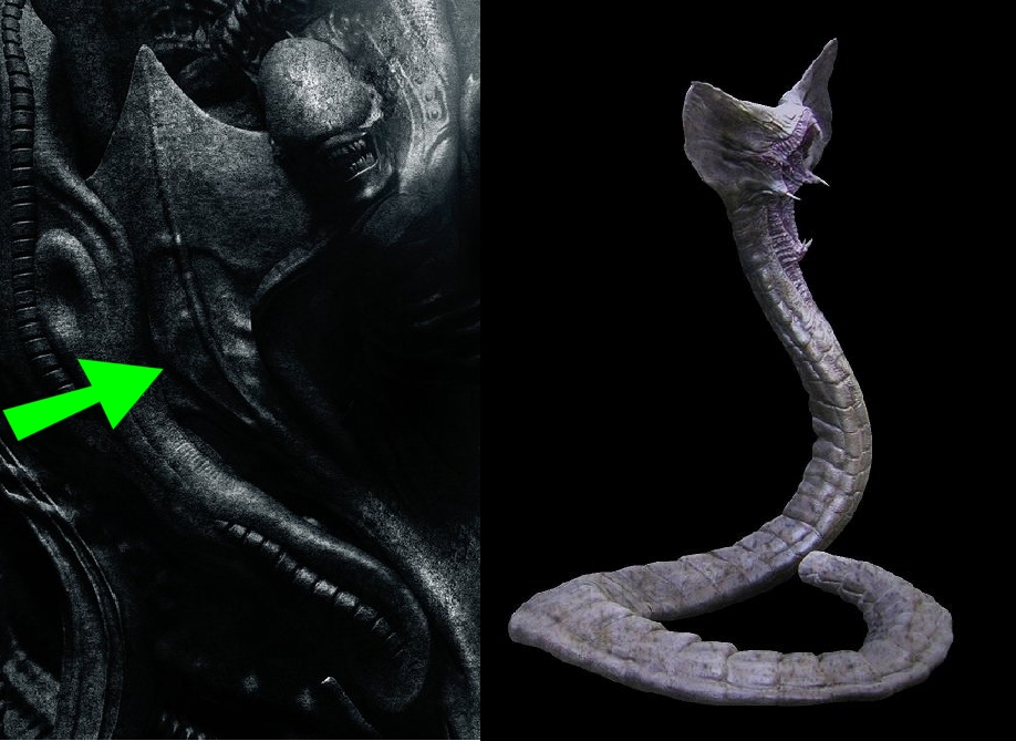 The Prometheus Mural was very vague but we could see there was Face Hugged Engineers with TWO kinds of Face Huggers and we see TWO kinds in this Poster too.