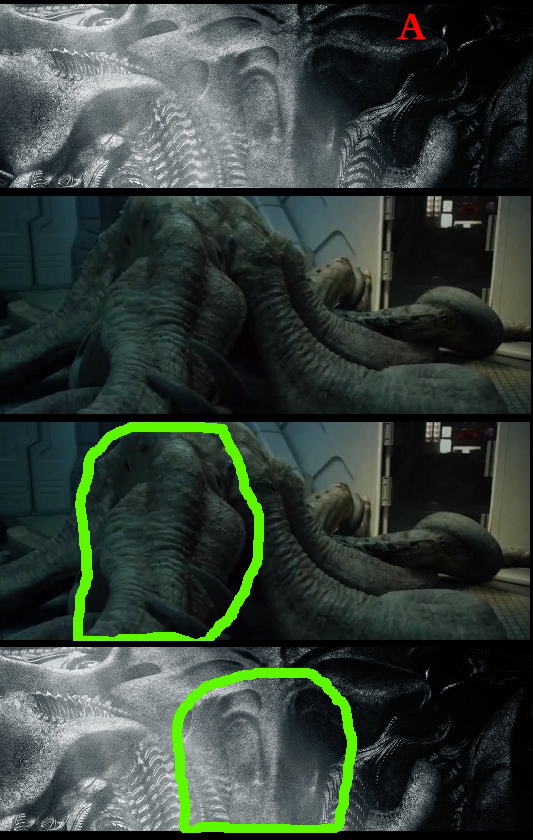 The alien at the top right of this image looks like it has different teeth than the xenomorph.