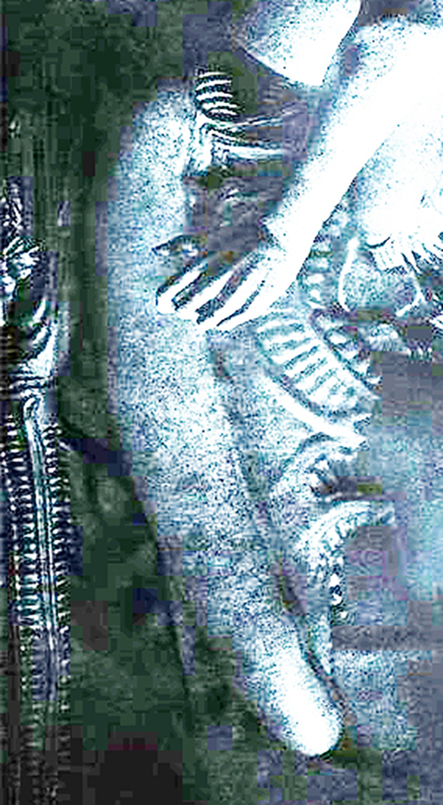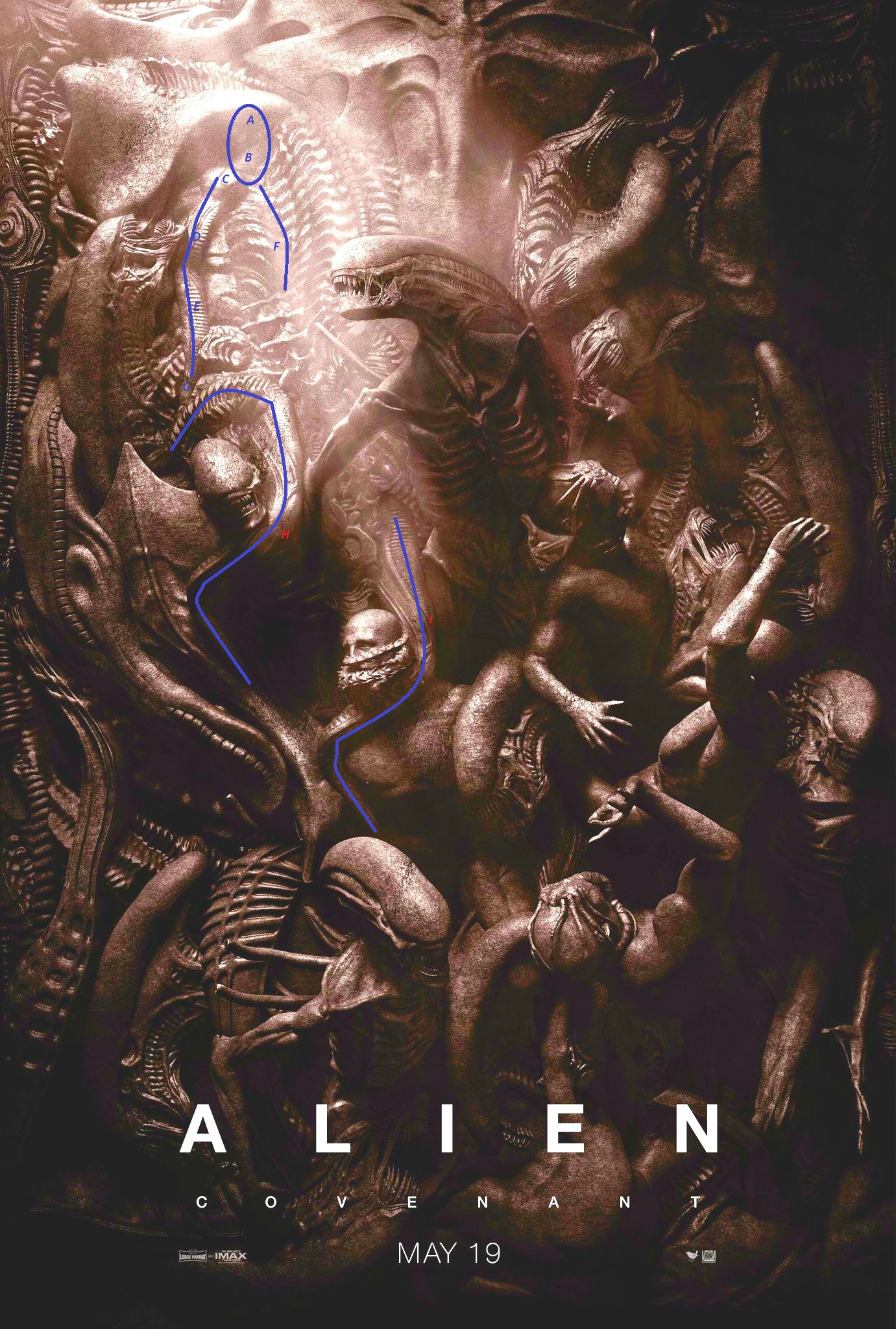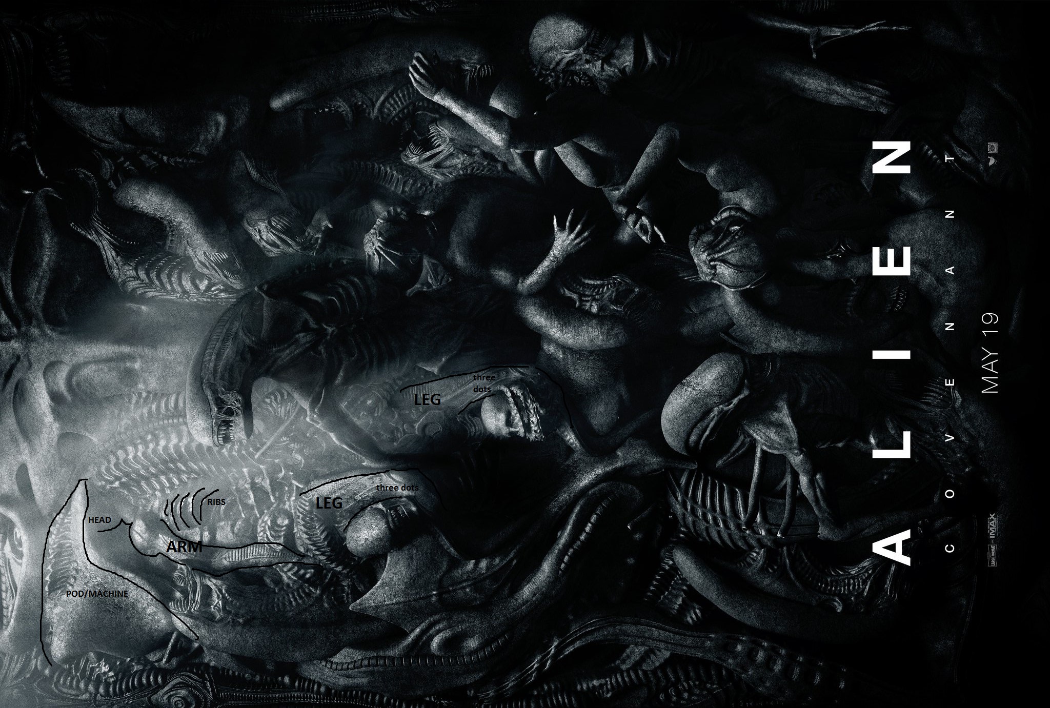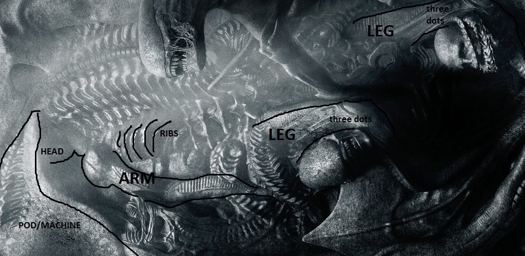 MemberPraetorianMarch 24, 201710655 Views22 RepliesI think there is a right shoulder and a long right arm in the left side of the poster. I believe it belongs to the right leg (next to the xeno head) and the left leg (next to the engineer's head). The two legs and the two knees look the same. The left leg seems to end in a tentacle but it does not, it is behind the engineer's body. I tried to hihglight the limbs in the image - and something which is covering the head.