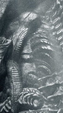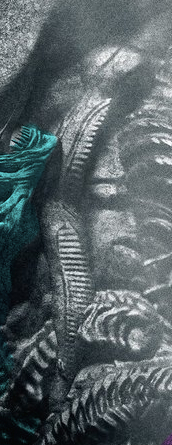 The monochrome, untreated areas are where the mystery remains. Although there is an arm visible in the top left quadrant with an accompanying rib cage, whatever this figure is meant to be has been morphed into the surrounding mass. More interesting is the pelvic shaped mass above this arm and the inhuman mass beneath the lowermost Engineer.