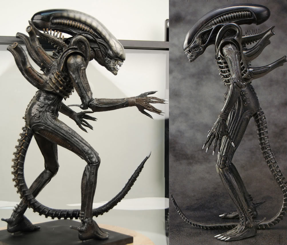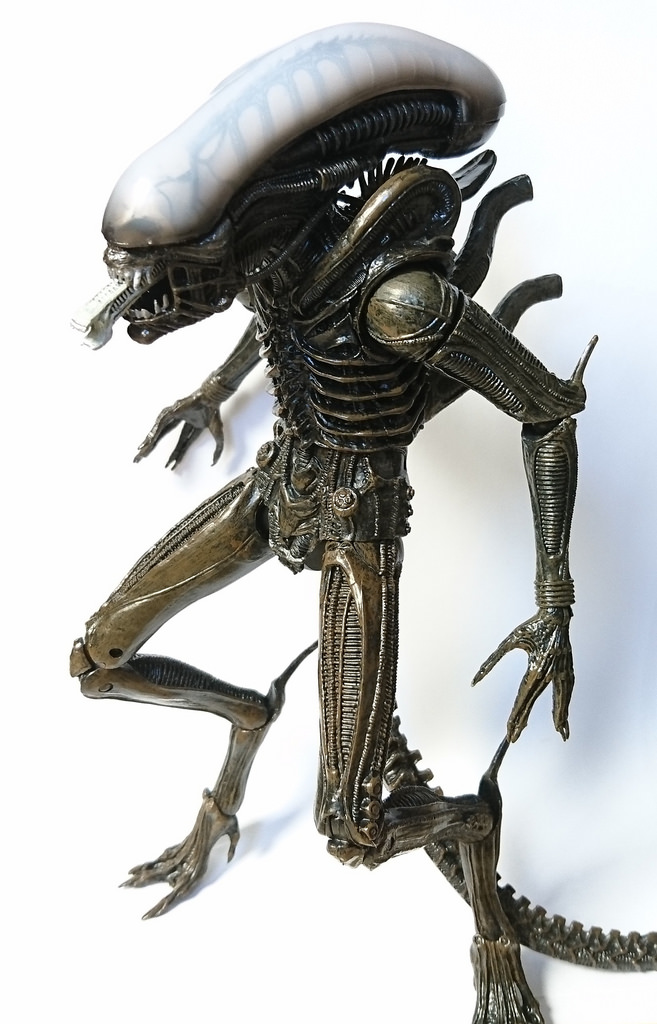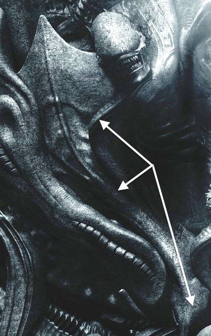 You will also notice that the three Protomorphs are shown almost unobstructed and unrestrained, whereas the numerous Xenomorphs seem to be overwhelmed, with only their heads visible among the mass. Most interesting are the four engineers, the three males of which are being subjugated, two by (differing) Facehuggers, and one by the Trilobite. The female engineer (the bosom/breast is too full to be male, the upper arm is less muscular and the hand is more feminine) is the only Engineer not being attacked, though like the other three Engineers her face is obscured.