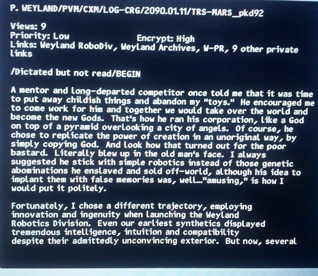 And while it might not be Canon, it has the right 'flavour' of the ALIENverse, at least to me, and fits Weyland's personality and character quite well.