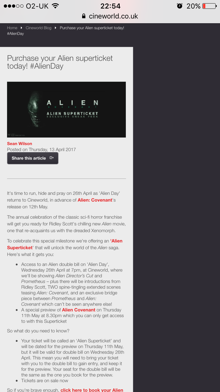Contacted the Cinema Directly and the person i spoke to was not aware of any Alien Covenant booking at said there Preview date is 11th May.