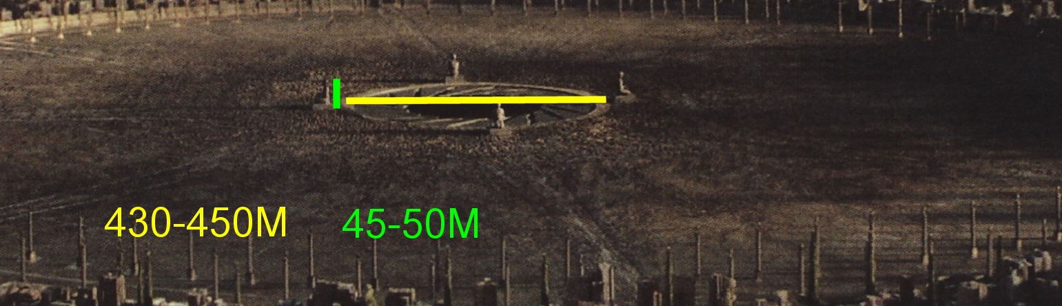 I worked out the diameter of the Courtyard based on the diameter of the Prometheus Hangers, assuming the one in this shot is the same size.