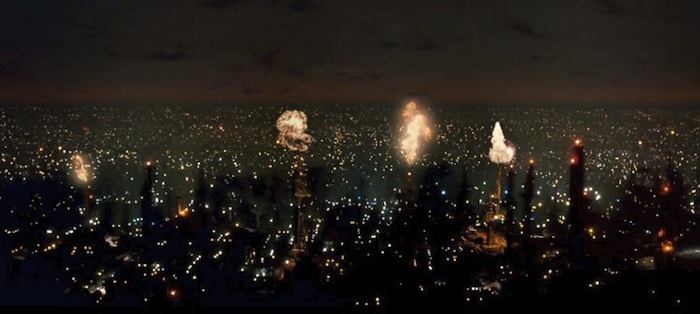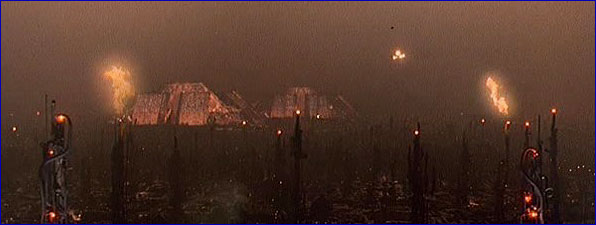 We see sprawling dystopian cityscapes and towering temple-esque company buildings: