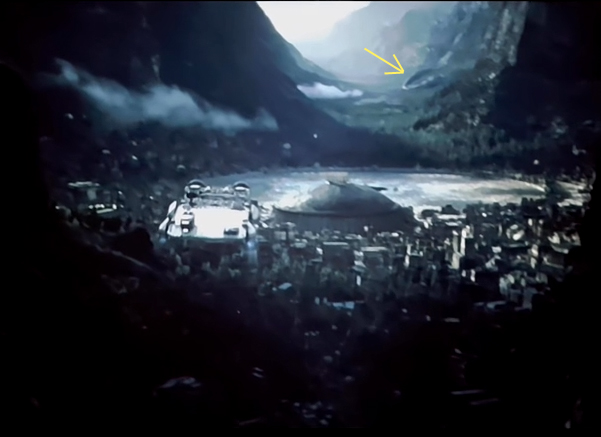 In this scene we see the base of the juggernaut for the first time. It has a large hole in the bottom that is used to deploy its bio-weapon (as we see later in the movie). After the ship crashed into the mountain the bomb bay would have scraped across the rocks.