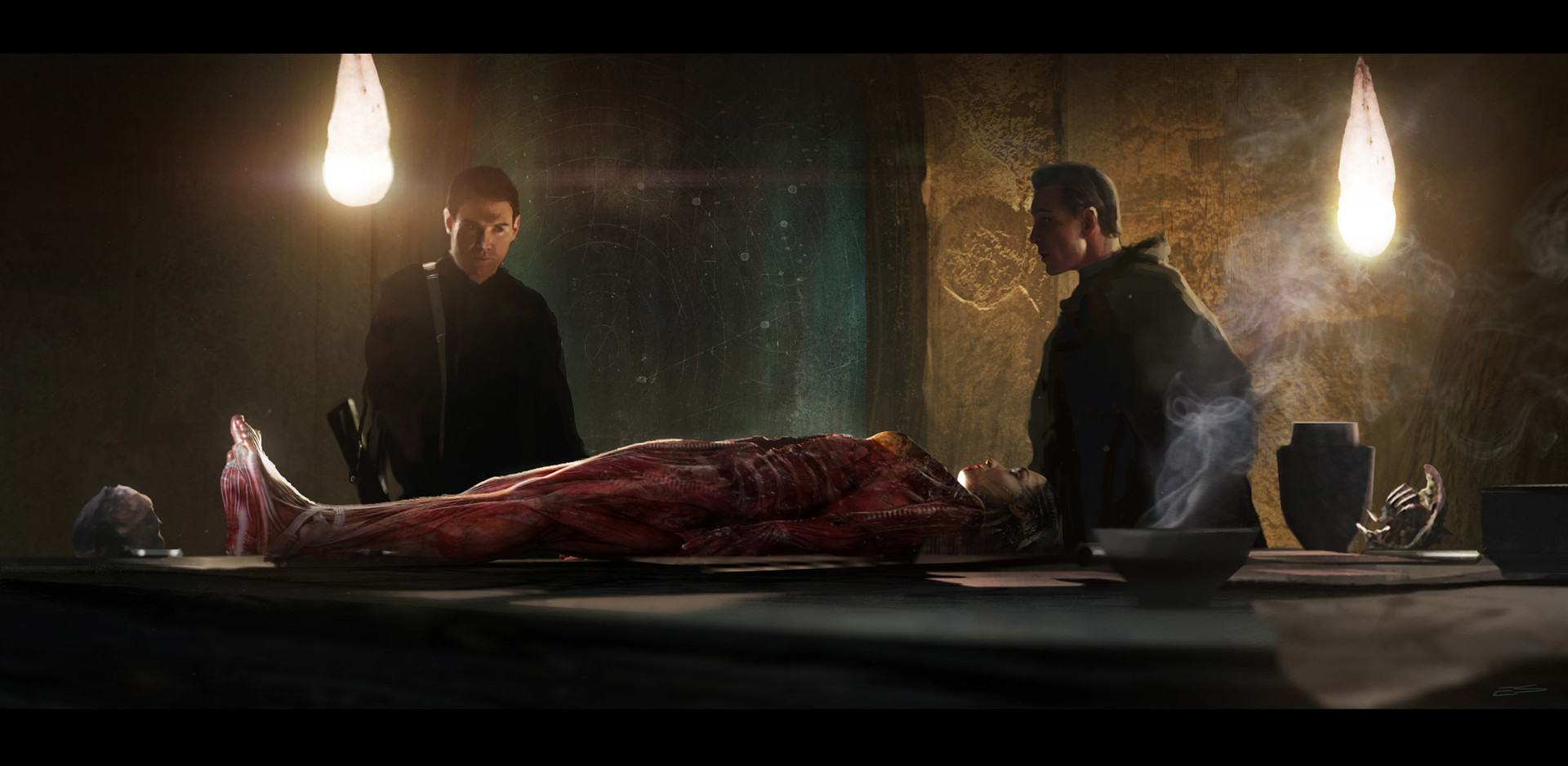 Ev Shipard: ‘Thanks Steve, As you can imagine it went through a ton of iterations and was really great to dive into the backstory here. I was keen to make the slab table like an alien autopsy or sacrificial bench with blood grooves as though the place was re-purposed by David.’
