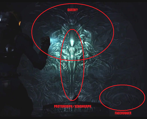 So, to recap, the alien in the mural is not a David-ultimate-classic-xeno (the biological original or its biomechanical eventual evolution) and has a weird head. And I call it an "Archeomorph".