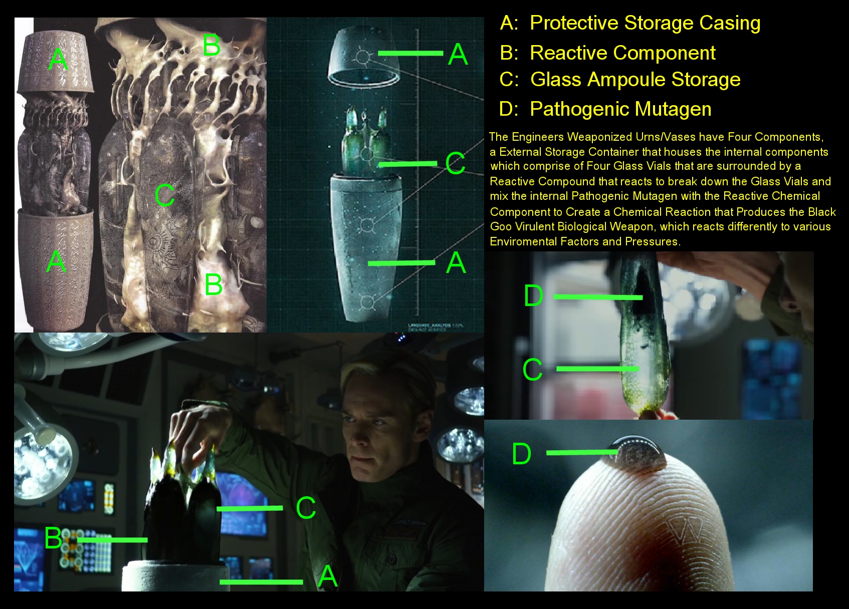 The Engineers Weaponized Urns/Vases have Four Components, a External Storage Container that houses the internal components which comprise of Four Glass Vials that are surrounded by a Reactive Compound that reacts to break down the Glass Vials and mix the internal Pathogenic Mutagen with the Reactive Chemical Component to Create a Chemical Reaction that Produces the Black Goo Virulent Biological Weapon, which reacts Differently to Various Environmental Factors and Pressures.