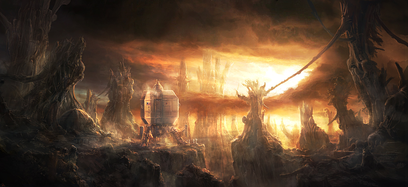 Space Jockey Planet -- 'This is my vision of the first human expedition send to discover the unknown mysterious race called the navigators or Space Jockey. This planet is dead for millenia and should look really different and alien. It’s a quite quick image, wanted to keep it rough and atmospheric.'