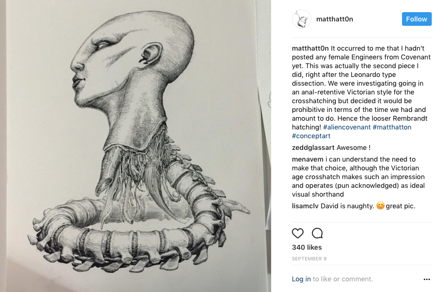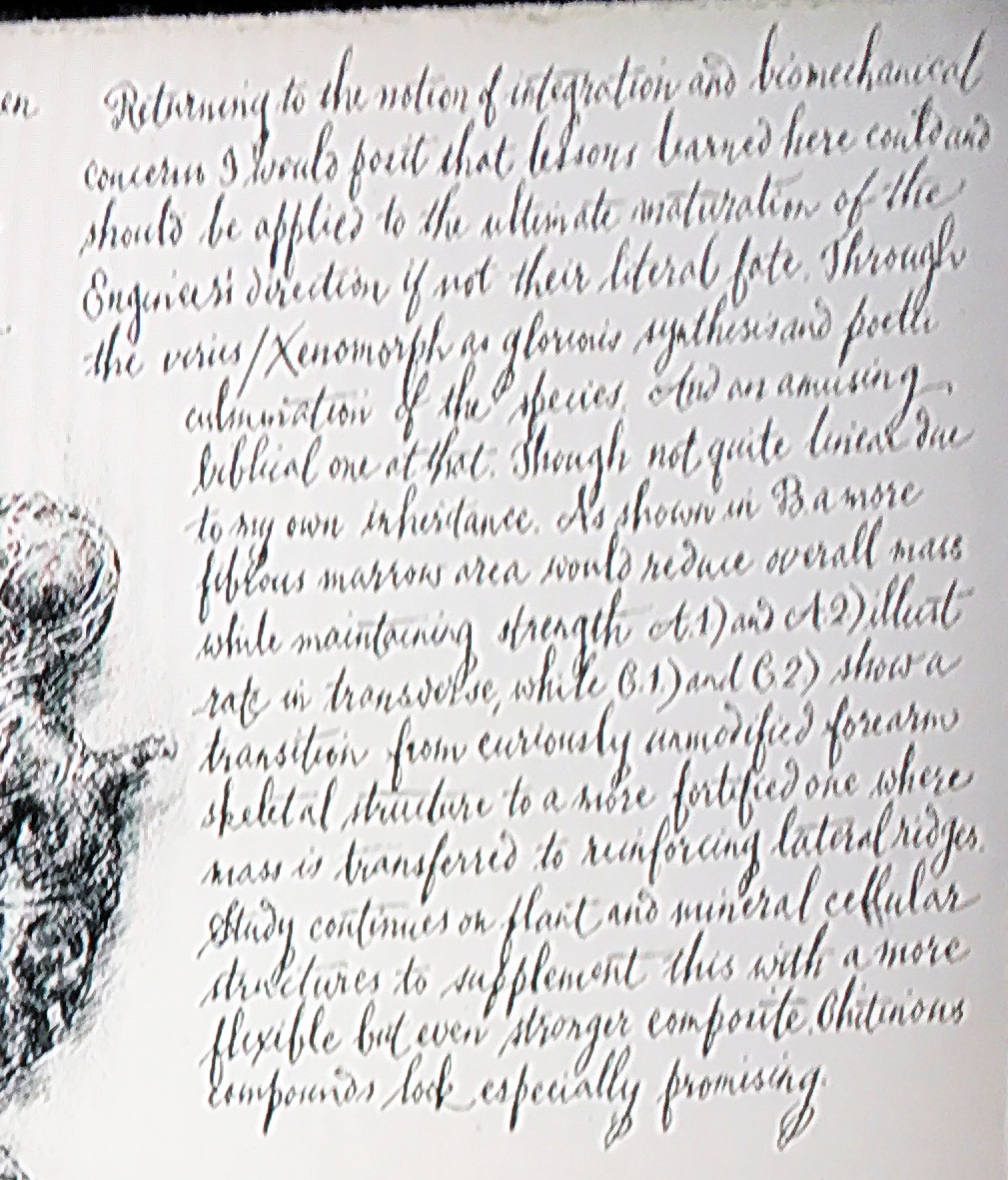 "Returning to the notion of integration and biomechanical concerns I would posit that lessons learned here could and should be applied to the ultimative maturation of the Engineers direction if not their literal fate. Through the virus / Xenomorph as glorious synthetic and poetic culmination of the species. And an amusing biblical at that. Though not quite linear due to my own inheritance."