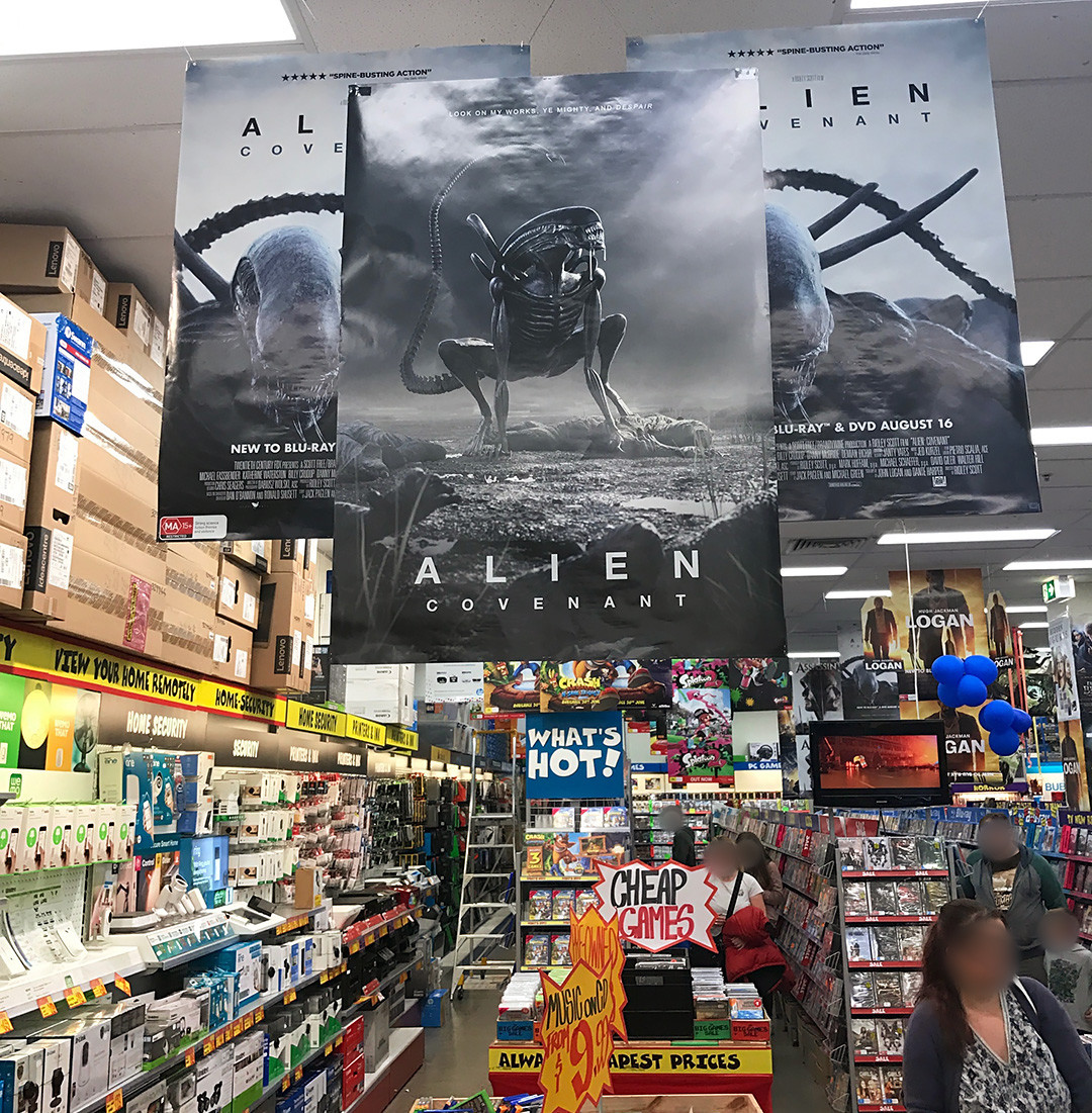 'So '20th Century Fox' held a competition to design a poster to help celebrate the Blu Ray release of Alien Covenant. This was my entry into that competition and I was lucky enough to have won. One of the prizes was to have your poster displayed in JB HiFi stores Australia wide and I'm pretty excited to see it all printed up!'