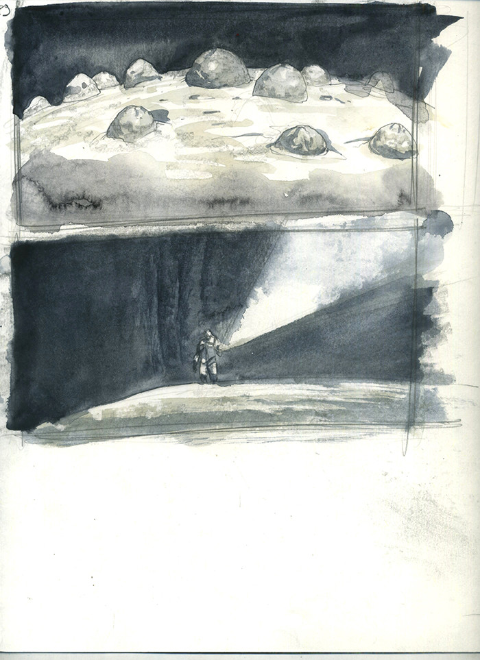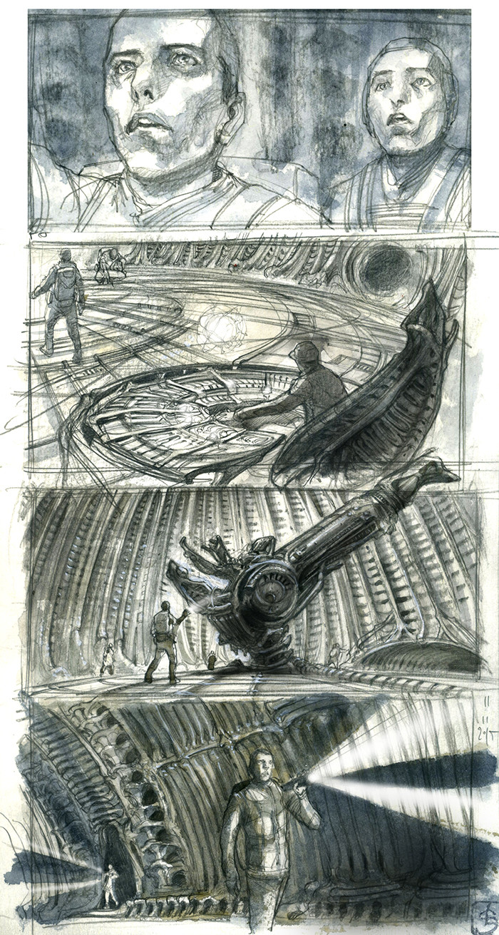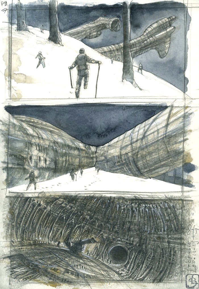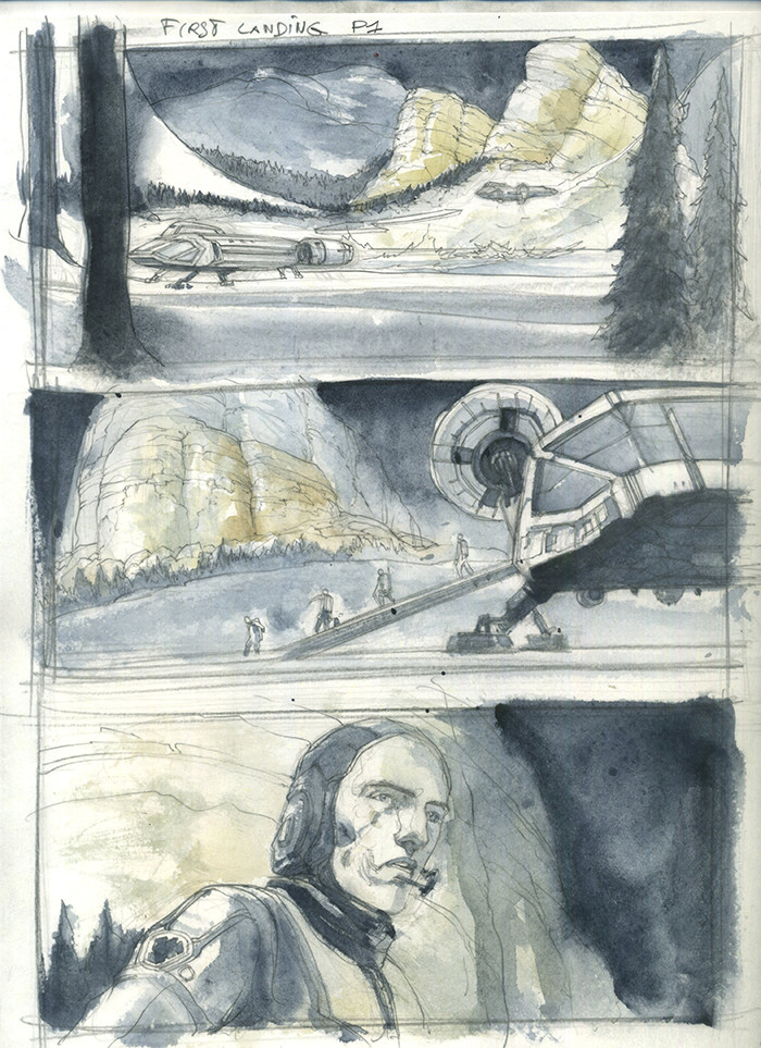 It is so very interesting to see what evolved into the movie from the story boards above. Small changes in concept make such a difference on screen. I do prefer the mote swarm used in the film opposed to an infected mosquito shown in concept.