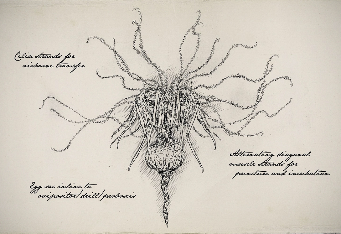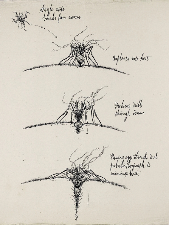 Passing eggs through dual proboscis/ovipositor to inseminate host.