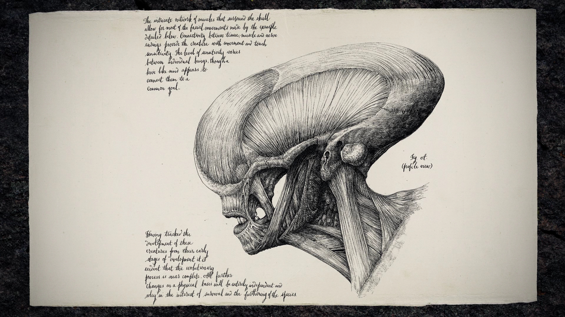 The intricate network of muscles that surround the skull allow for most of the facial movements made by the example detailed below. Connectivity between tissue, muscle and nerve endings provide the creature with movement and touch sensitivity. The level of sensitivity varies between individual beings, though a hive like mind appears to connect them to a common goal.