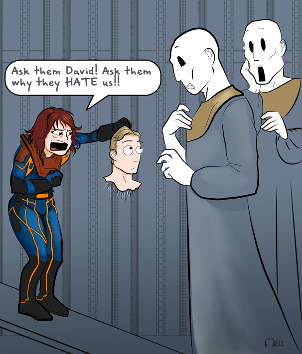 This was something a good friend and I had talked about yesterday when we hung out for a bit and ate some froyo at a local joint. I had to wonder just what the heck Shaw was planning when she finally made it to the Engineer’s planet. She’s totally out of her element, totally vulnerable, and totally unprepared for any part of her journey. I imagine that she arrives, hair messed up, smelly, and probably low on food, with a beheaded android and they land in an area with a bunch of 9 foot tall aliens surrounding the ship. The door swings open and here she stands with the disembodied head of David clutching in one hand. I’m sure at this point the Engineers would be all O.o