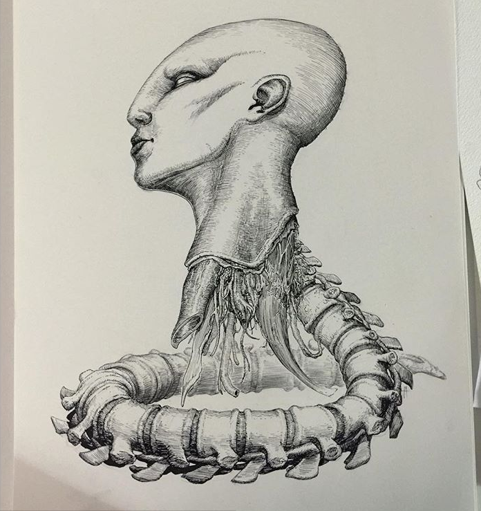 /Image by Matt Hatton: 'It occurred to me that I hadn't posted any female Engineers from Covenant yet. This was actually the second piece I did, right after the Leonardo type dissection. We were investigating going in an anal-retentive Victorian style for the crosshatching but decided it would be prohibitive in terms of the time we had and amount to do. Hence the looser Rembrandt hatching!'/