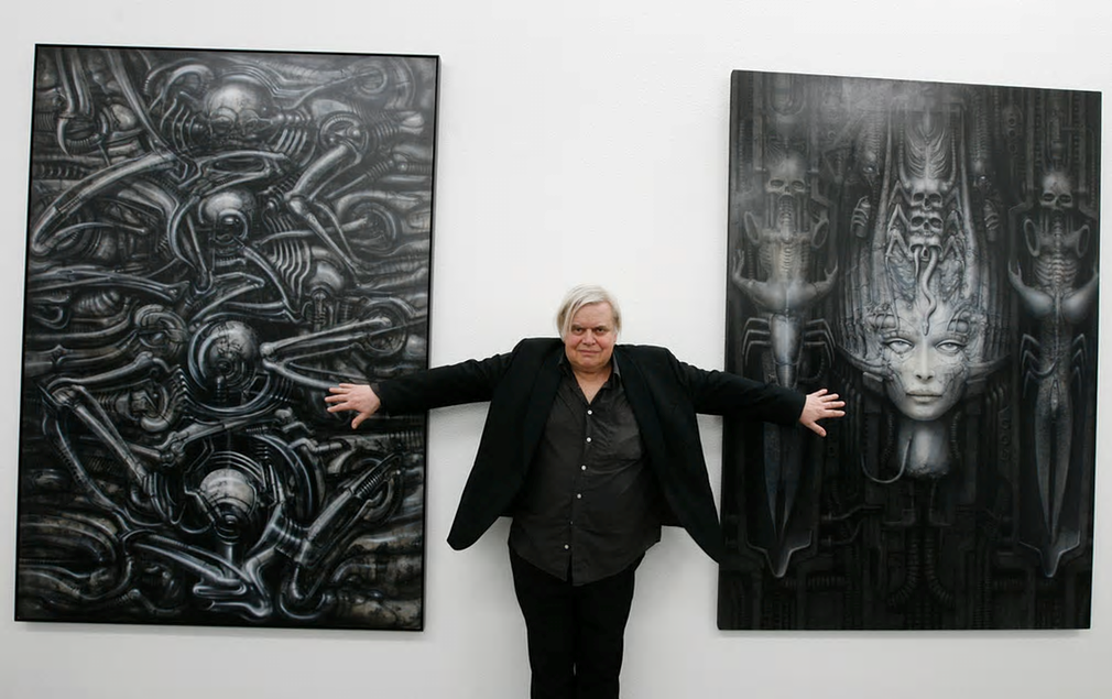 HR Giger poses with two of his works at his exhibition at the art museum in Chur, Switzerland. Photograph by Arno Balzarini/AP: