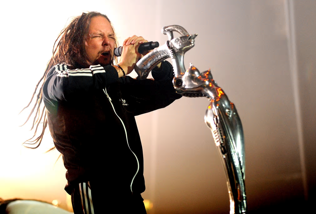 Jonathan Davis, of the rock band Korn, performs with a microphone stand designed by HR Giger. Photograph by Shirlaine Forrest/WireImage: