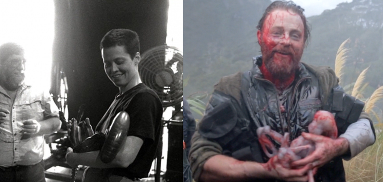 25 years later: Nathaniel Dean cradles the Neomorph on the set of Alien: Covenant (2017).