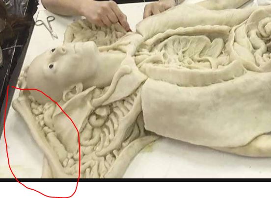 Looking at more details in the finished version, I'm thinking some of this stuff could the be cut-out sections of the front of the ribcage, along with most of the entrails, like intestines and stuff. The only other things I can't see resembling any part of a human are the left circles. The top one almost resembles facehugger fingers, and the lower one has a pattern I don't recognize.