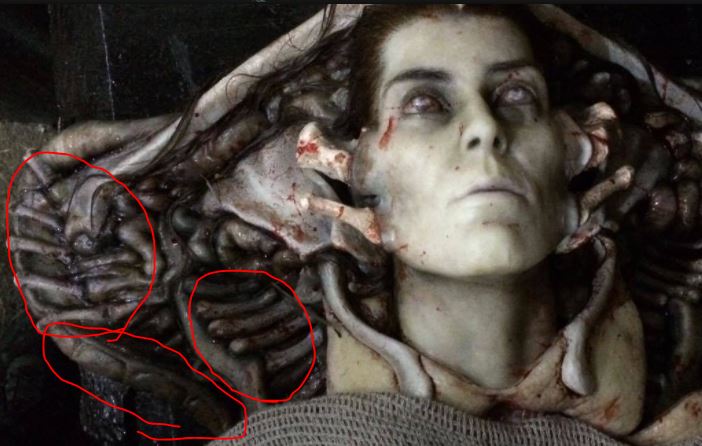 I think this prop was the basis for shaw and they added color and hair and more distinct facial features later. And true, it looks like there are two bones coming out of each side of her face. I'm thinking the two skinny bones still connected to the flaps of skin over her neck are just collar bones.