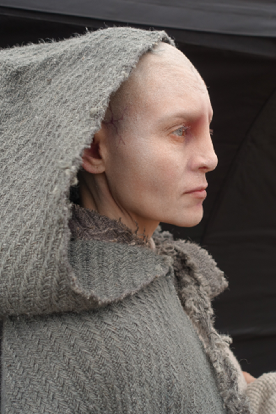 As you can see, their skin is more pinkish and their eyes have lighter sclera (probably because they had no eye lenses unlike the engineer actors from Prometheus who had) but are bald and have a much higher nasal bone like LV-223 Engineers. They also wore tunics, hoods and sandals.
