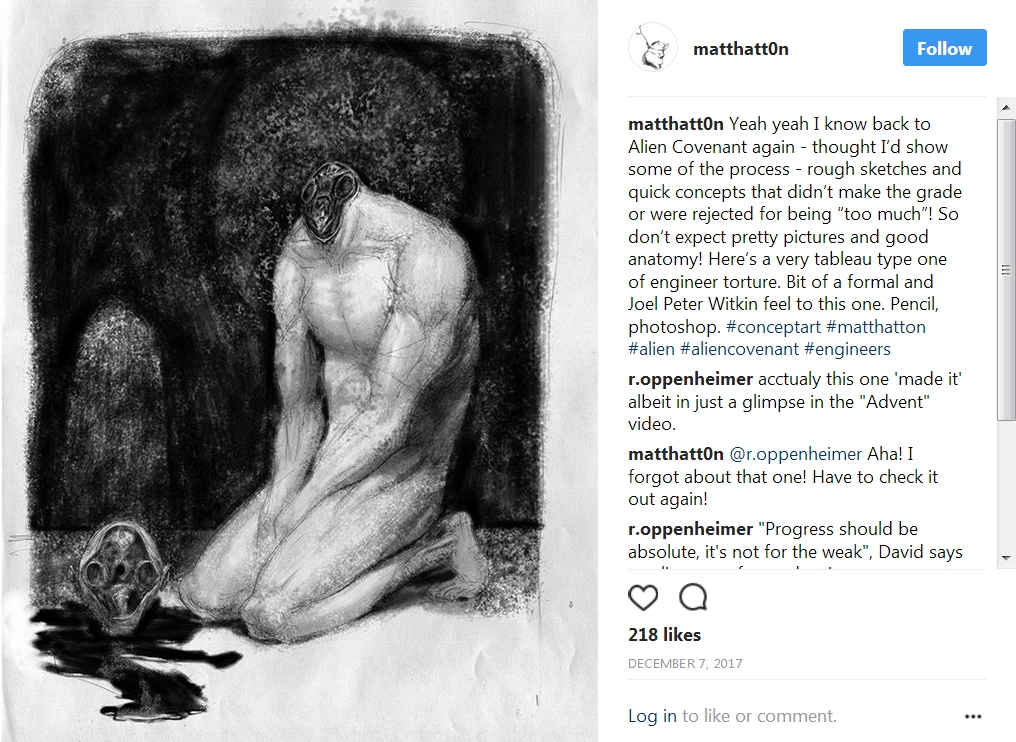 I will add that Matt Hatton hinted at changing scripts... so we dont know when he was brought into the Project, but there was a number of drafts and changes on Harper's Draft by Logan and the work they had done was around the Summer of 2015, i wonder when Harper came on board? As i am not sure Hatton would be brought in during the last time Green worked on the Project (Autumn 2014) but it could show that the Evolution and Re-working done by Harper to the point of the Final Changes made by Logan, then maybe during this process our Engineers and their City may have had more of a Giger Aesthetic than we ended up with.