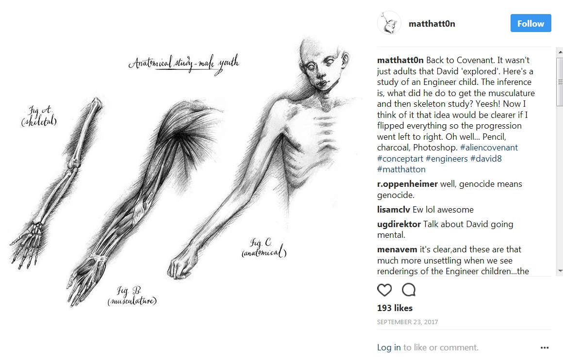 @r.oppenheimer But here's the zinger. If he's already killed everyone in the metropolis, he might be reviving them (we saw this in the previous film) or cultivating them specifically for his 'work'! Same with the different 'conflicting' drawings of Shaw. They could be different Shaws, or the same Shaw revived and reconstructed to be pulled apart again. Or maybe even worse David really is creative in a very human way and the drawings are his plans of what he might have done or eventually did do. I wanted it so that any way you slice it (bad choice of words), he's a bit of a worry to say the least! But that even though we know for a fact he killed them, at least leaving some ambiguity opens it up again instead of closing things off and being reductive. The rest of Covenant is pretty literal and I didn't want to do that in my own little part at least. Cheers!
