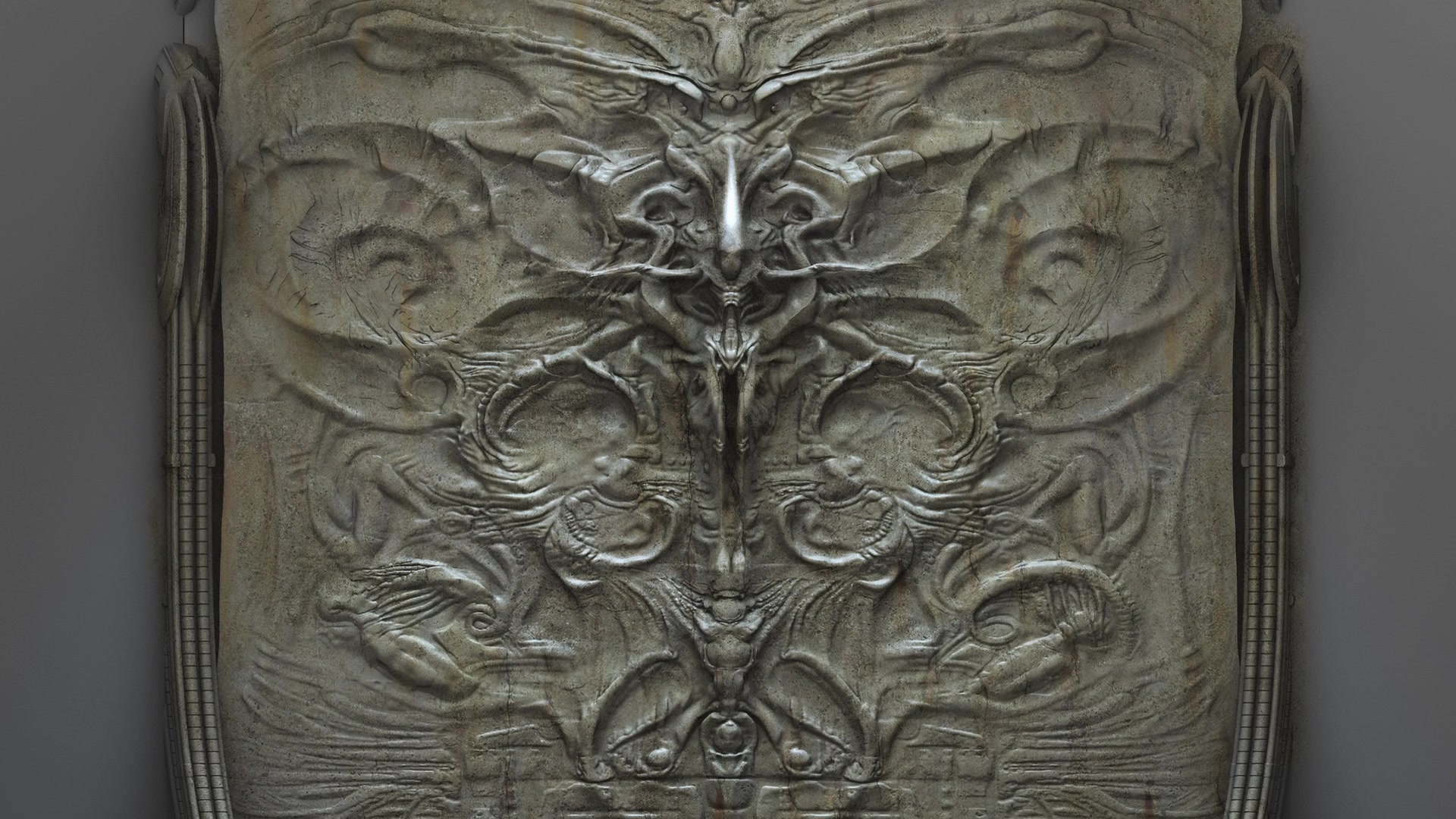 When comparing the mural found in the ampule room on LV-223 with H. R. Giger's art an unforeseen possibility presents itself. Rather than just showing the life cycle of the Deacon, and by extension the Xenomorph, the mural could also be showing the source of the Xenomorph eggs. Many of Giger's artworks feature women in a similarly bound position, usually portraying the act of consummation. You will notice a macabre parallel between these paintings and the mural, with the central figure's abdomen, opened, with mirrored fetal figures separating it and the depictions of Xenomorph parasites implanting hosts with their embryos. The mural could also be depicting an Engineer females body being used to create Ovomorphs.