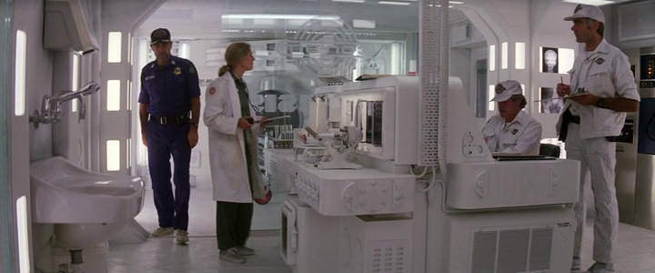 The High Noon influence is quite obvious from any cursory plot synopsis, but the film’s similarity to Alien strikes as soon as we’re granted a look at the film’s environments. Actress Frances Sternhagen, who played O’Niel’s only ally, Dr. Lazarus, recalled that the sets were dank and dingy, with Hyams’ explanation being that the mining facility needed to look lived in, an aesthetic that George Lucas had referred to as the ‘used universe’. It can be seen in the grubby interiors of the Millenium Falcon in Star Wars before it was rendered again in Ron Cobb’s designs for the Nostromo a few short years later, but this look not did originate with either of those films, instead being preceded by Dan O’Bannon’s Dark Star, where it was intended to be a jokey counterpoint to Kubrick’s glossy 2001: A Space Odyssey. “[The future is] not lucite domes where people glide back and forth wearing jump suits, and everybody is perma-pressed,” Hymans explained. “The only consideration was the performing of a task, and that’s true of all the designs for Outland. Function is the only criterion.” Compare these comments with Ron Cobb’s design philosophy: “My design approach has always been that of a frustrated engineer. I tend to subscribe to the idea that form follows function. If I’m to arrive at a cinematic spacecraft design that seamlessly preserves, as in this case, the drama of the script, the audience has to experience it as something impressive and believable.”