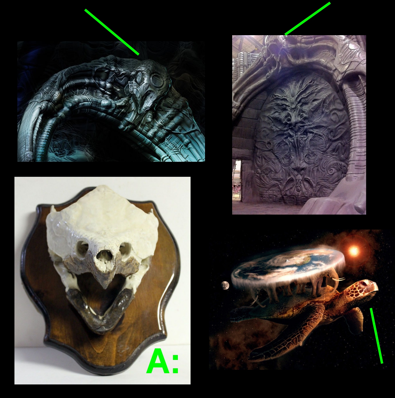 Basically Combine the World Turtle Mythos with the Cosmic Egg Mythos, but connect it to ALIEN with a HR Giger take on it. i pondered do we have ONE very Large Bio-Mechanical Turtle Craft, or Multiple Smaller Ones? But still like Death Star Size!