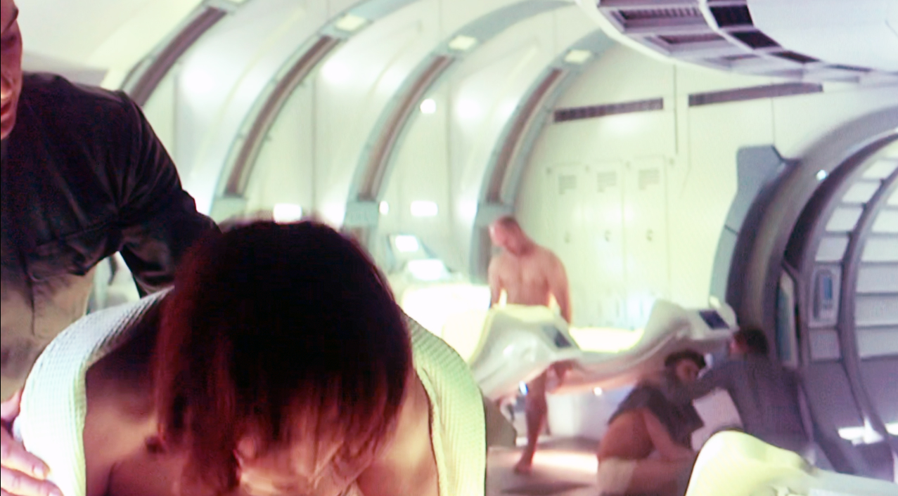 This was right after Vickers said to David to wake everyone up but there was a break after David walked in the room with the opening hypersleep pods before the cut to the second pair of flip flops.
