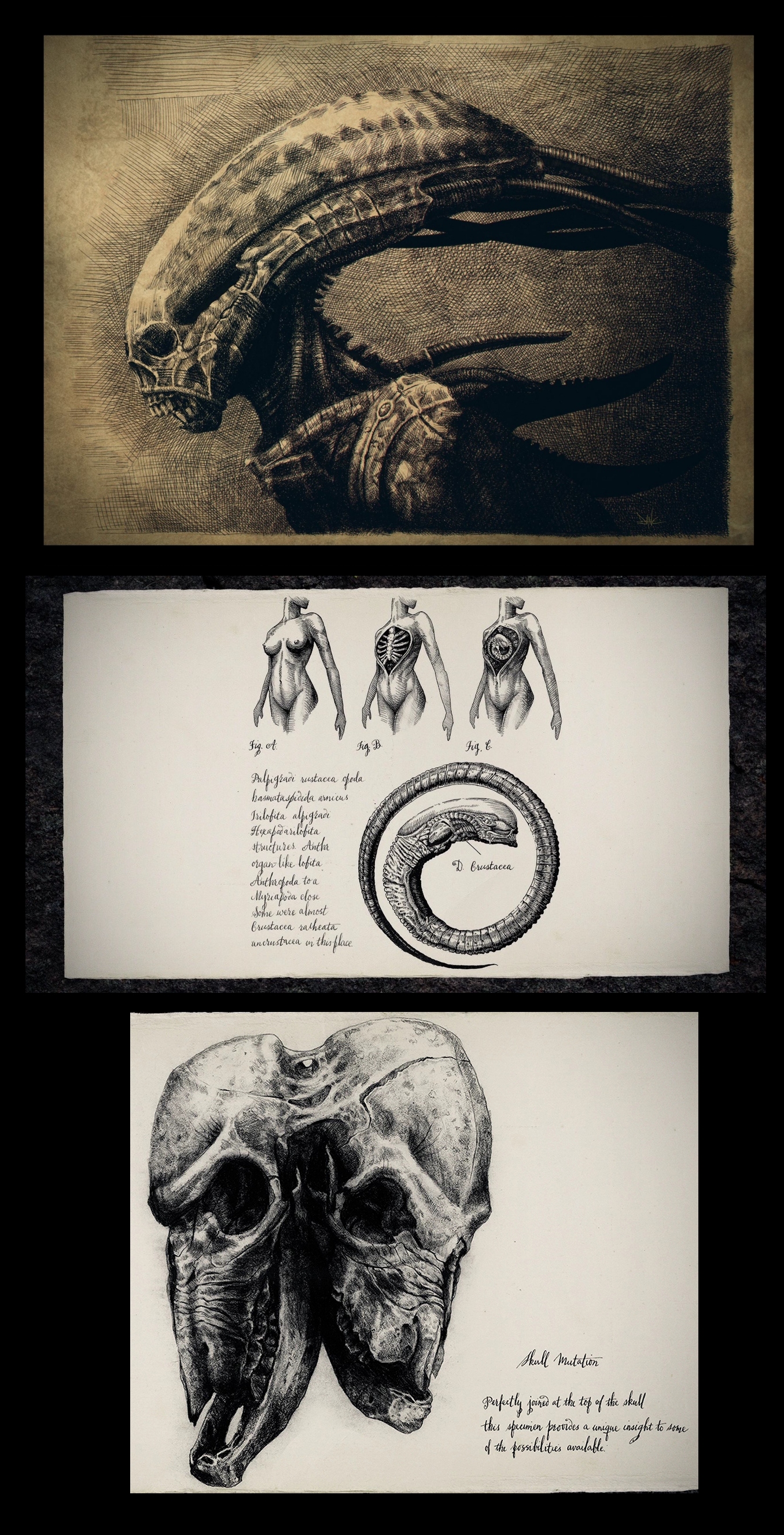 From these... we see the TOP looks more Bio-Mechanical than Davids Xenomorph, we see Middle shows the Classic Chest Buster, and Bottom is somewhat closer to the Space Jockey.