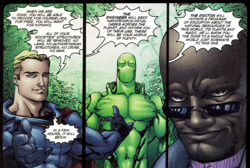 A later Stormwatch arc, collected as the trade paperback A Finer World (Stormwatch vol. 2 issues #2–4) explored this Engineer's legacy: the Nevada Garden, his first and sole surviving nanotech oasis, was secretly commandeered by the United States military and used for weapon creation. Apollo and The Midnighter destroyed the site on behalf of Stormwatch, and brought most of its nanotech 'trees' into Stormwatch custody.
